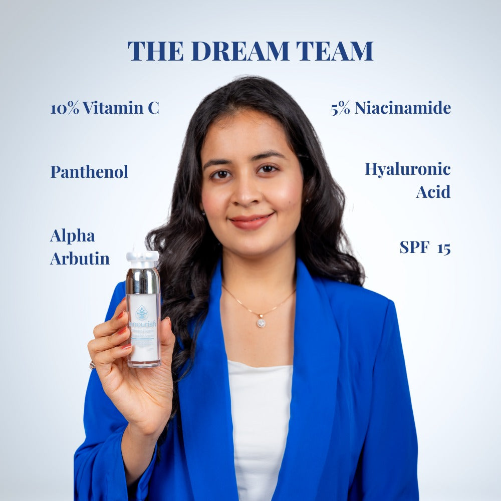 Powered by 10% Vitamin C, 5% Niacinamide, Hyaluronic Acid, Alpha Arbutin, Panthenol, and SPF 15,