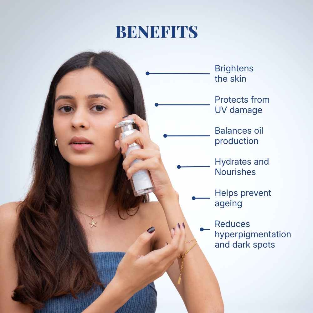 it brightens, hydrates, protects, and targets dark spots, pigmentation, uneven tone, and enlarged pores — while soothing your skin and boosting collagen.